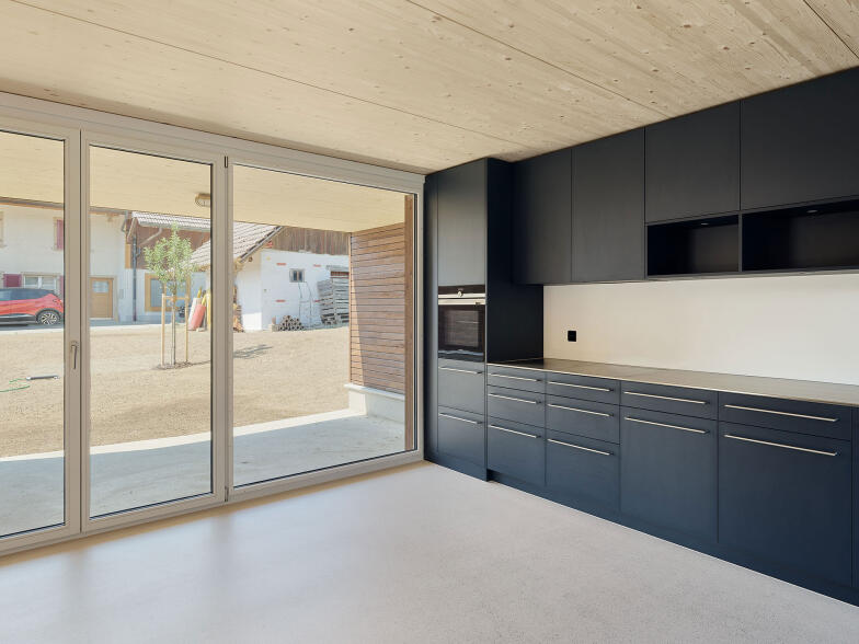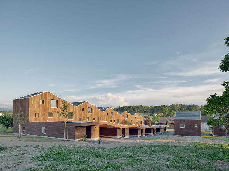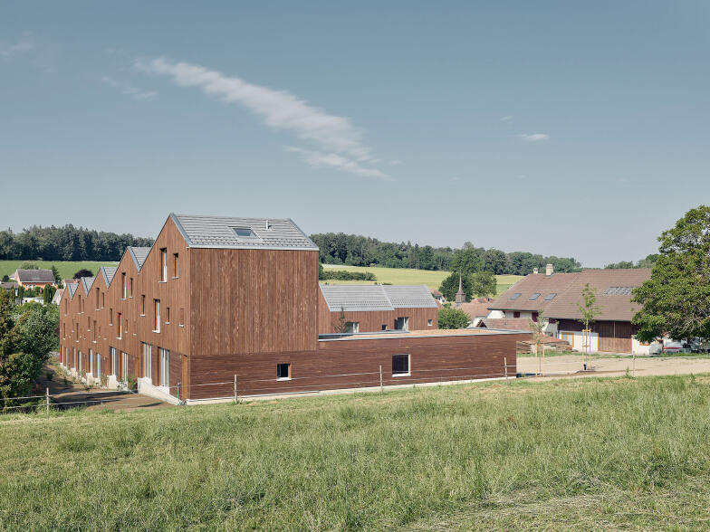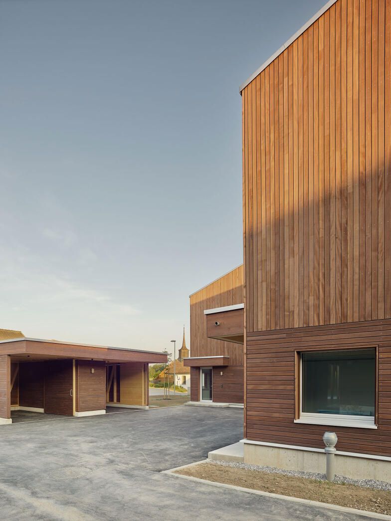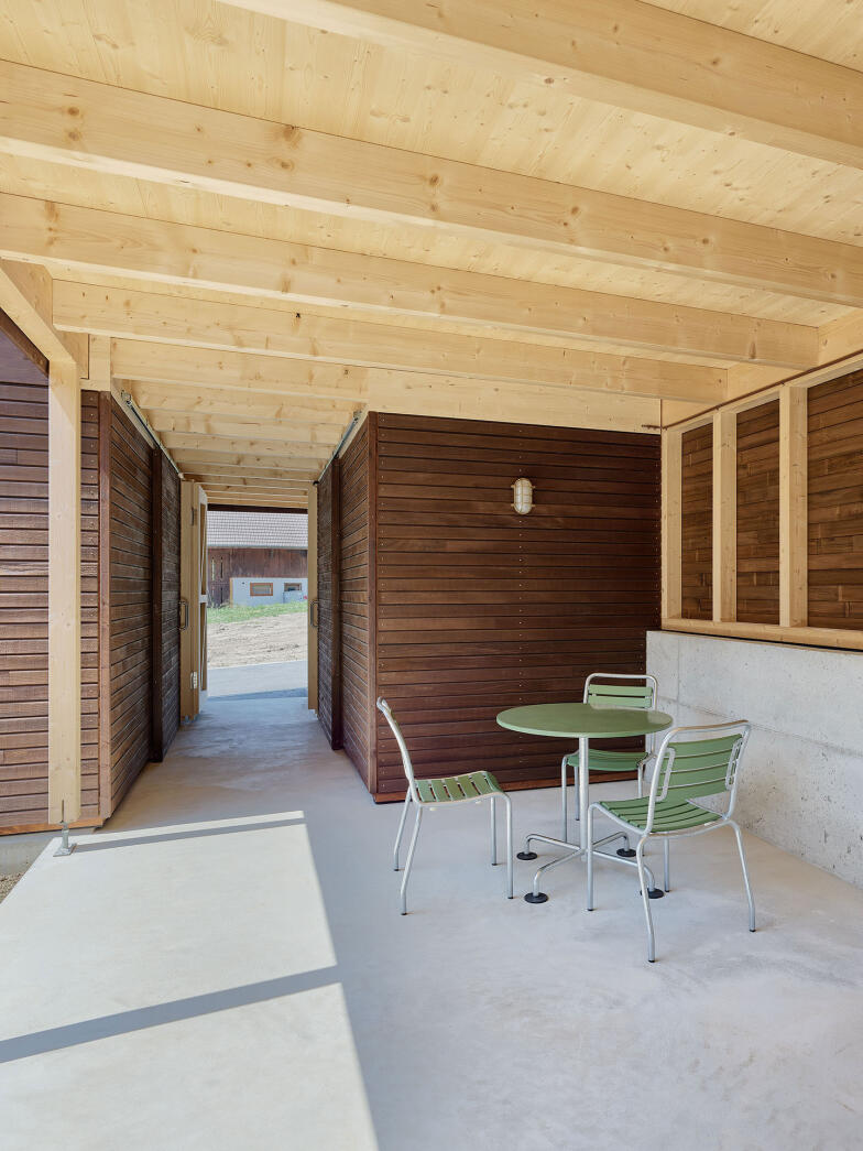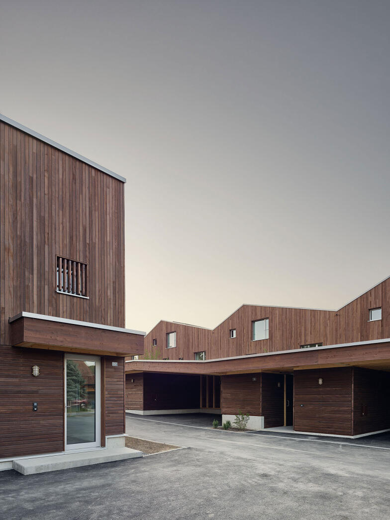 die äussere Erscheinung der Bauten lehnt sich insbesondere mit der dunkelbraun gefärbten Holzschalung an die Architektur der ortstypischen Landwirtschaftsbauten an.