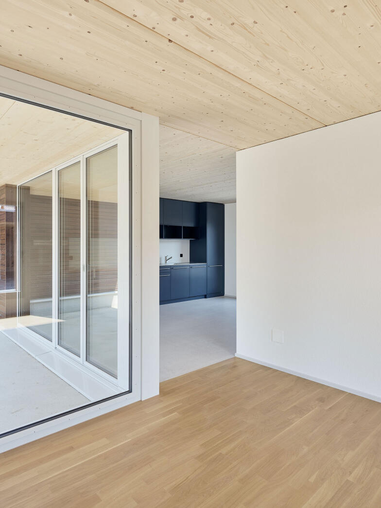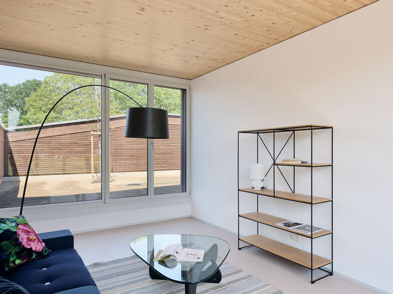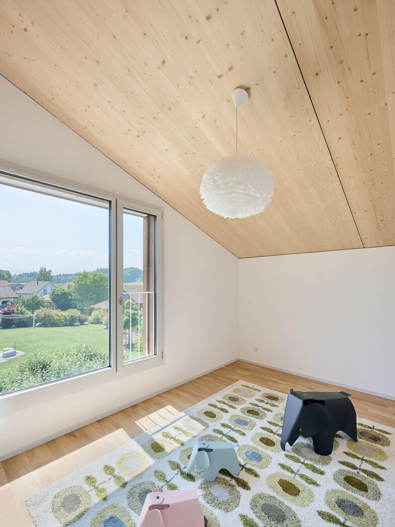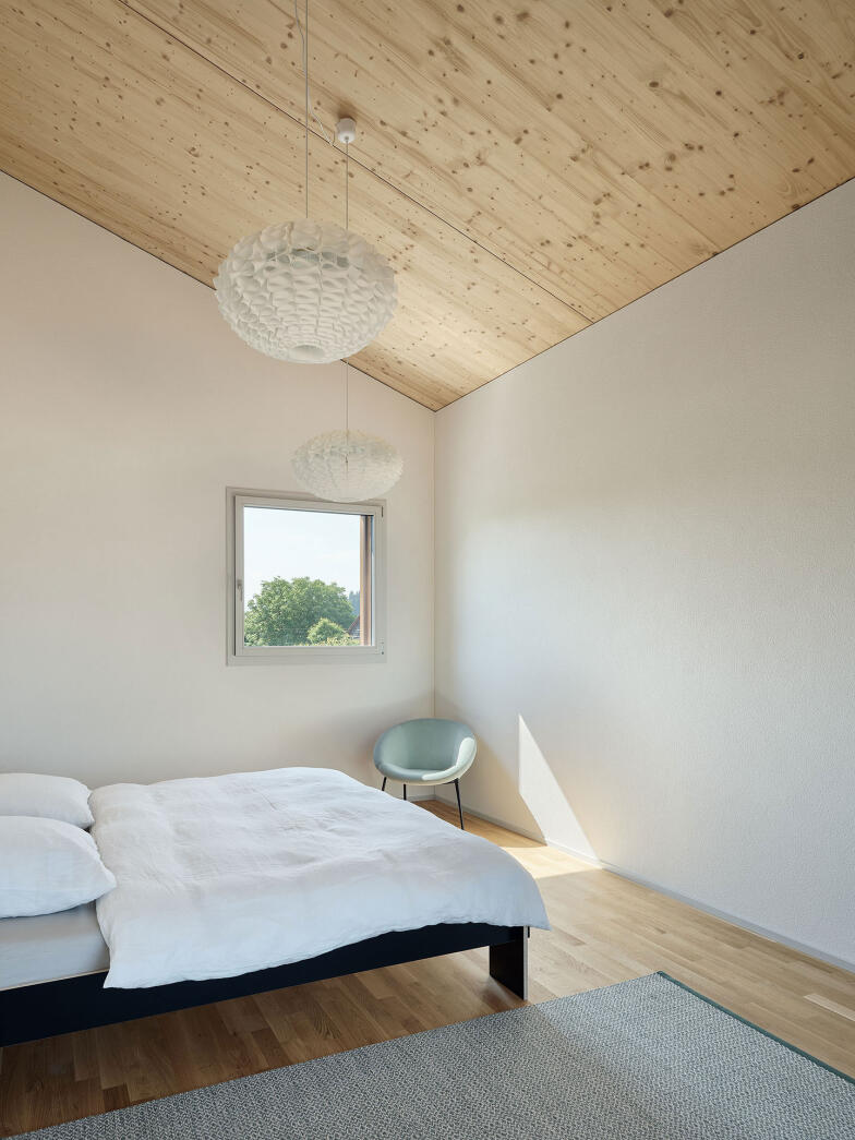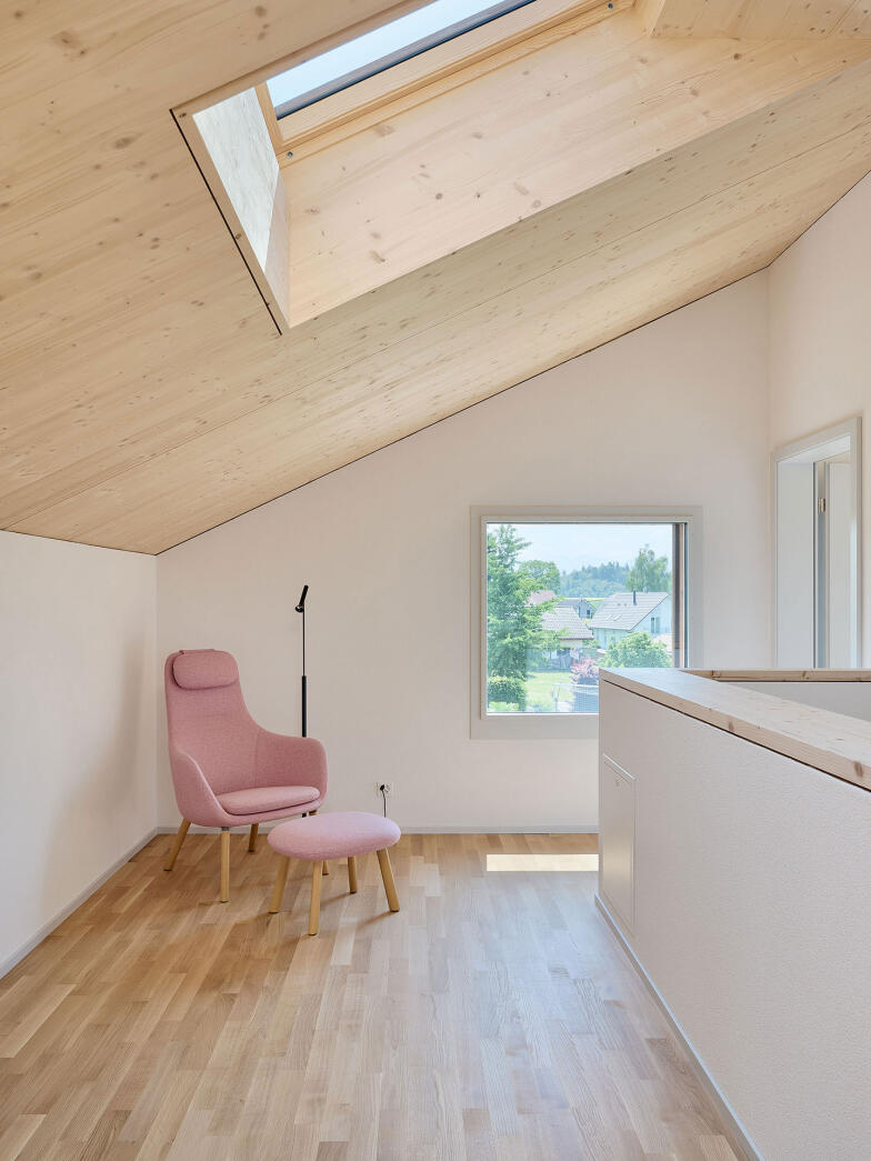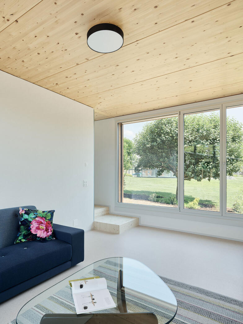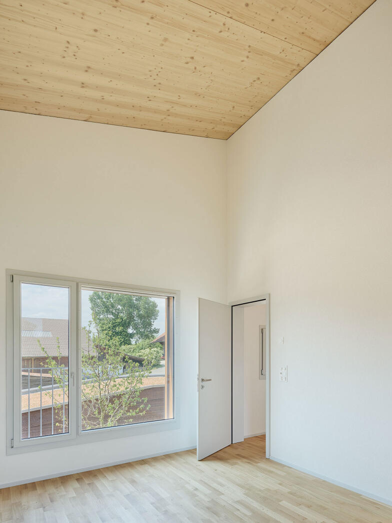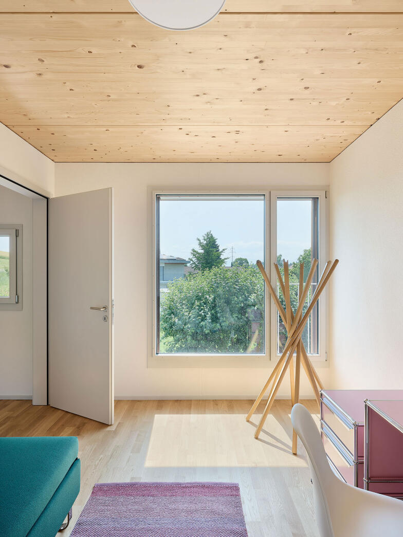 Das Raumprogramm der beiden Haustypen erstreckt sich über drei oberirdische Geschosse. Die Einzelwohnhäuser verfügen zudem über ein Untergeschoss. Die Wohnräume sind im Erdgeschoss angeordnet. Grosse Öffnungen schaffen starke Bezüge zu den Aussenräume. Die Obergeschosse nehmen jeweils vier Zimmer auf. Quadratische Fenster unterschiedlicher Grösse ermöglichen spannende Ausblicke in alle Richtungen.