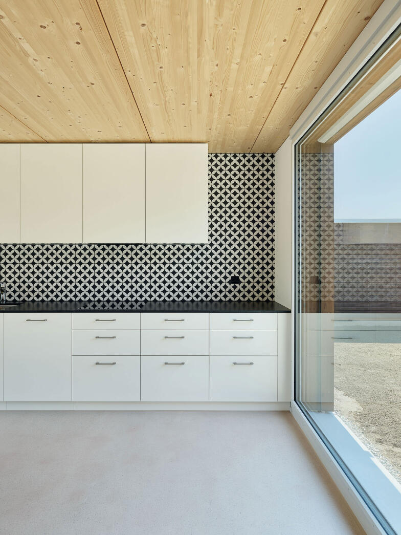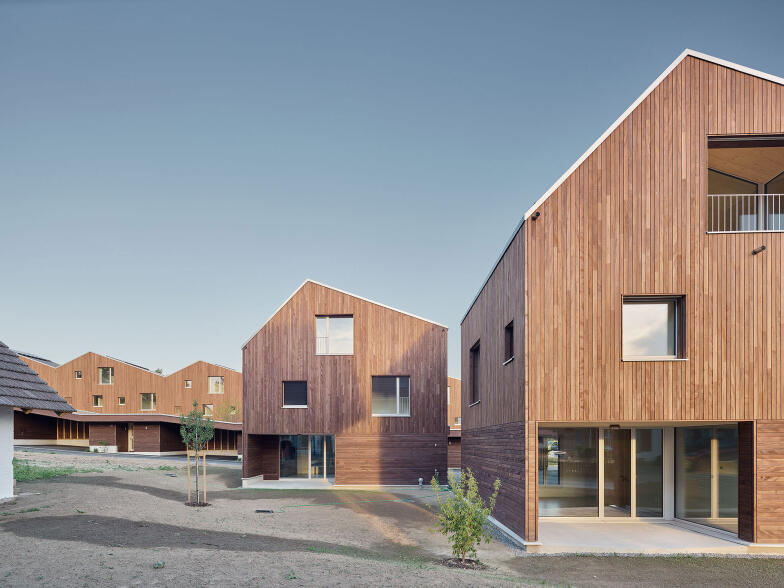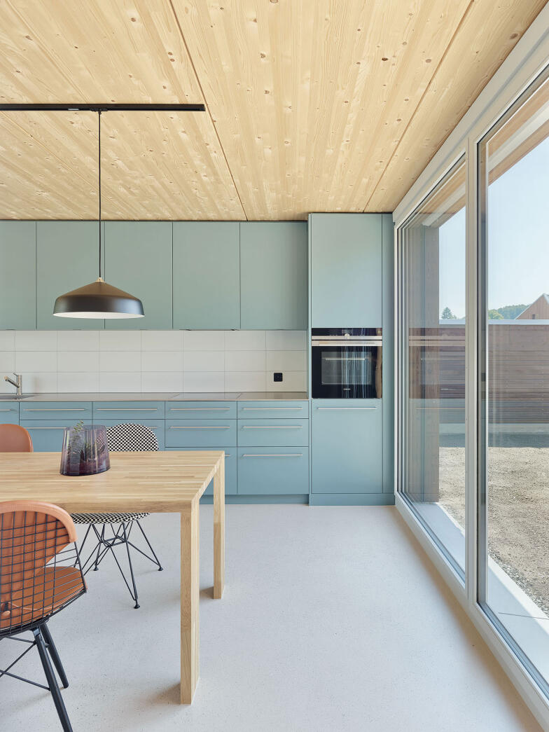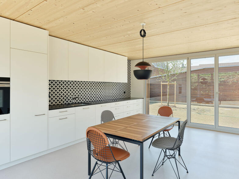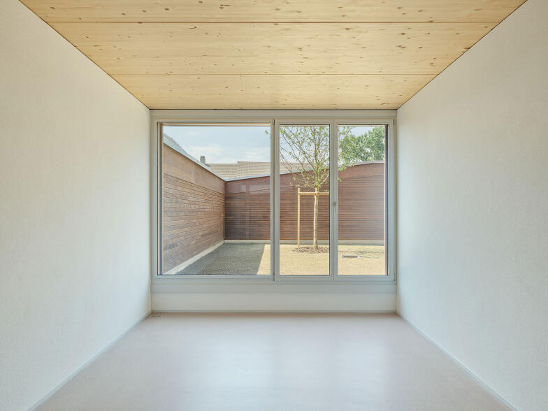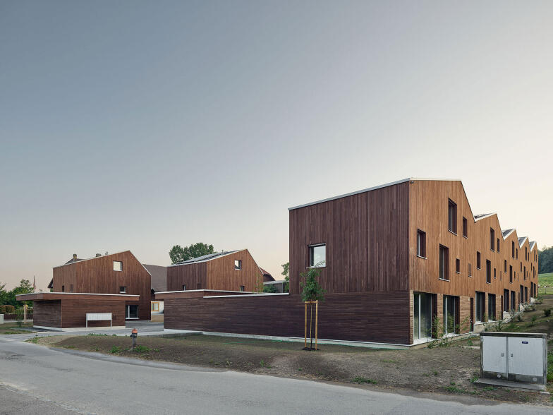 Die Reihenwohnhäuser sind entgegen der traditionellen Typologie mit der Kurzseite aneinandergestellt, wodurch sie von einer grossen Fassadenfläche profitieren und über die ganze Bautiefe optimal mit Tageslicht versorgt werden können. Entlang der Zufahrtstrasse bietet ein zusammenhängender Nebenbau pro Wohneinheit Platz für Autos und Fahrräder. Dazwischen entsteht ein grosszügiger, allseitig geschlossener Hof. Ein überdachter Bereich führt wettergeschützt zum Haupteingang und dient zugleich als Terrasse. Auf der gegenüberliegenden Hausseite entsteht zur südöstlichen Grundstücksgrenze hin ein kleiner Garten.