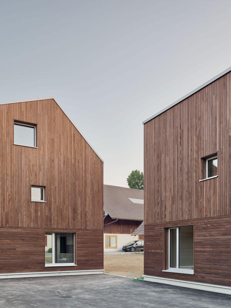 Die beiden Einzelwohnhäuser stehen zusammen mit einem Nebenbau gruppiert und spannen in ihrer Mitte einen Platz auf, der als gemeinsame Erschliessung dient. Durch die ortsbauliche Setzung entstehen für beide Bauten klar begrenzte Aussenräume auf der Westseite. Ein Gebäudeeinschnitt schafft einen grosszügigen, wettergeschützter Aussenbereich.