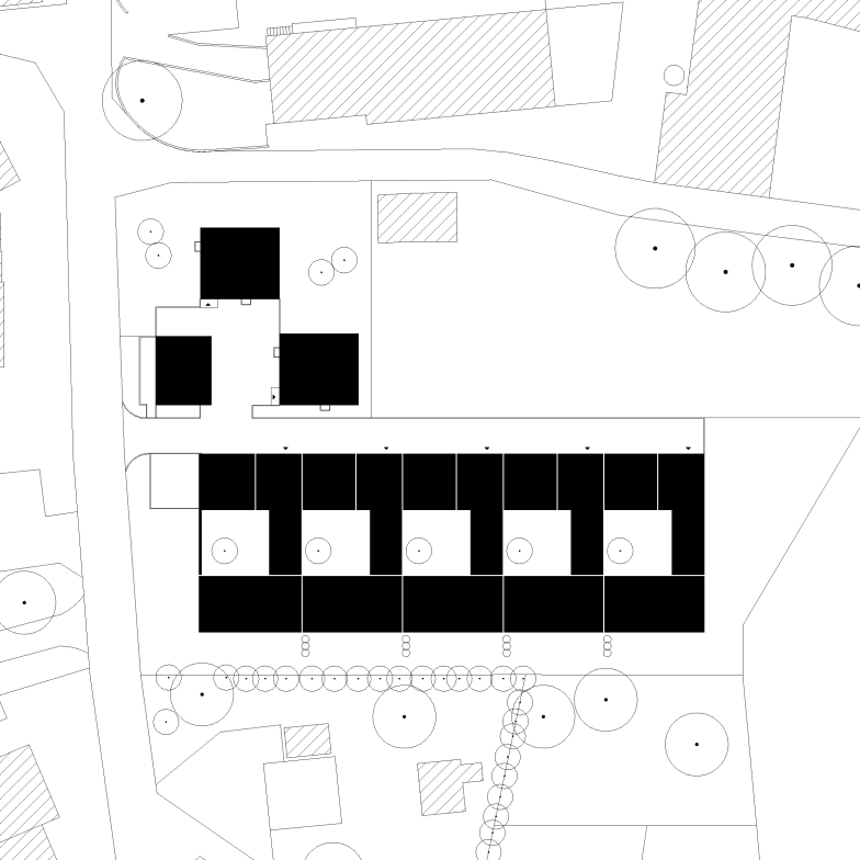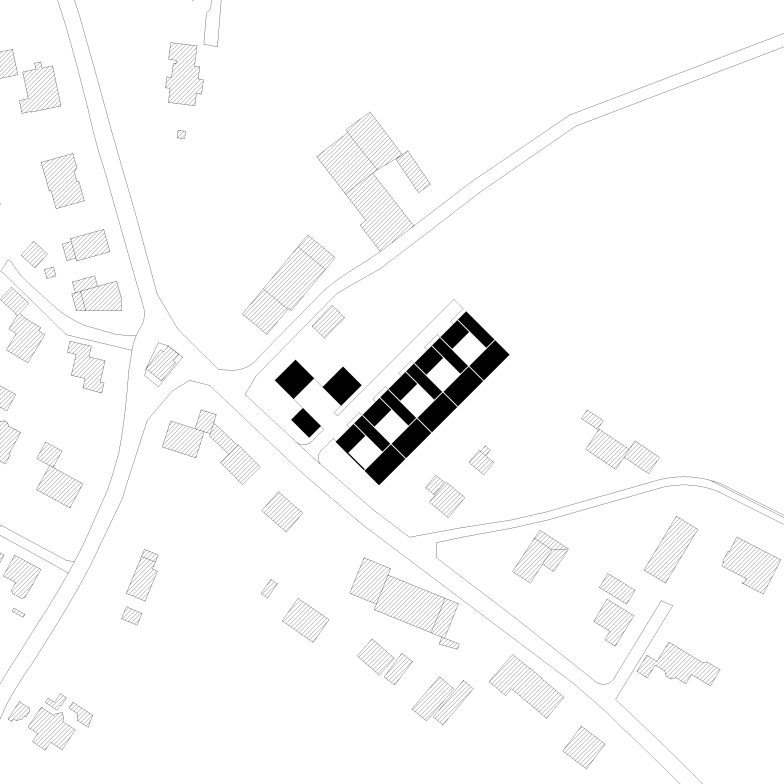 Die Erschliessung innerhalb des Grundstücks erfolgt über eine neue, mittig angelegte Zufahrtsstrasse. Ein linearer Baukörper mit fünf Reihenwohneinheiten erstreckt sich der Topografie folgend entlang der östlichen Parzellengrenze. Auf der gegenüberliegenden Seite stehen versetzt zueinander zwei punktuelle Einzelwohnhäuser, sowie zwei weitere Parzellen, welche zu einem späteren Zeitpunkt überbaut werden.
